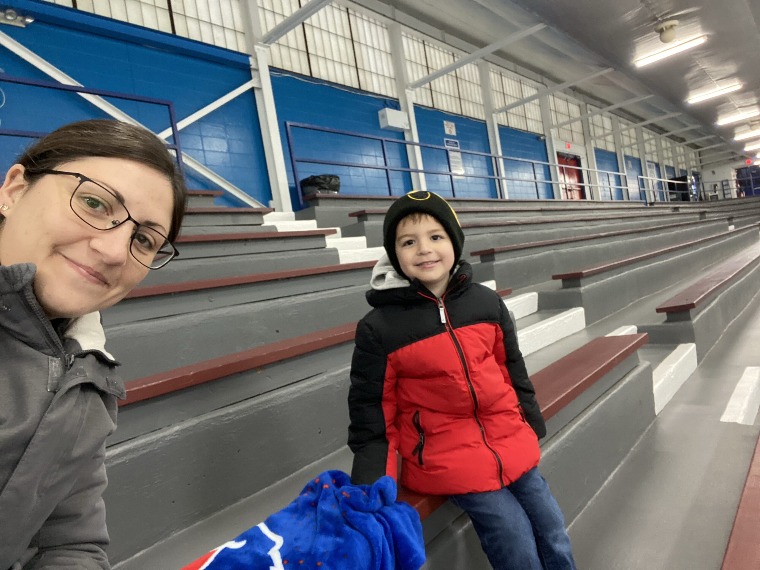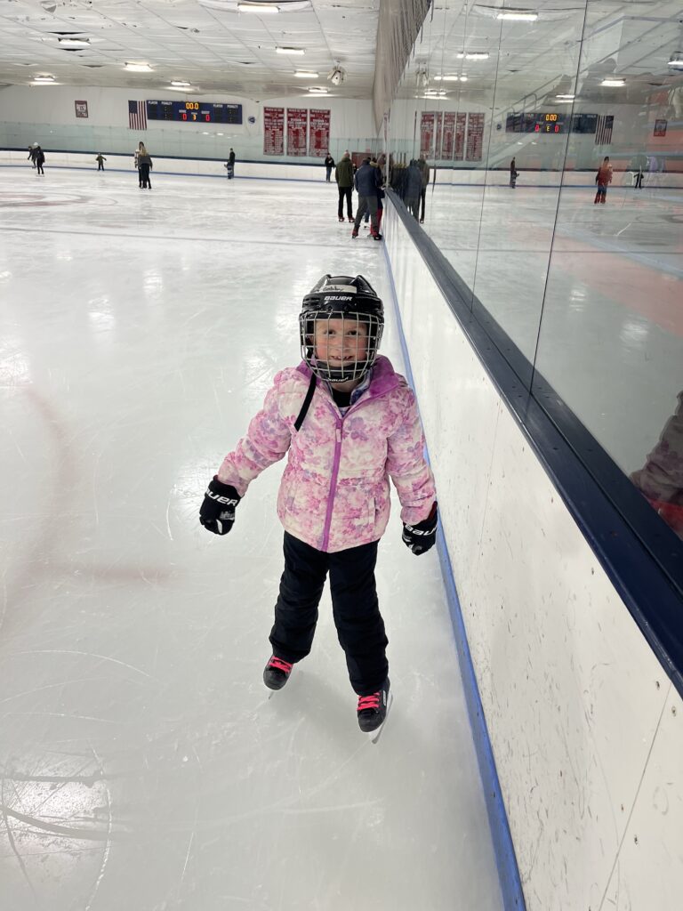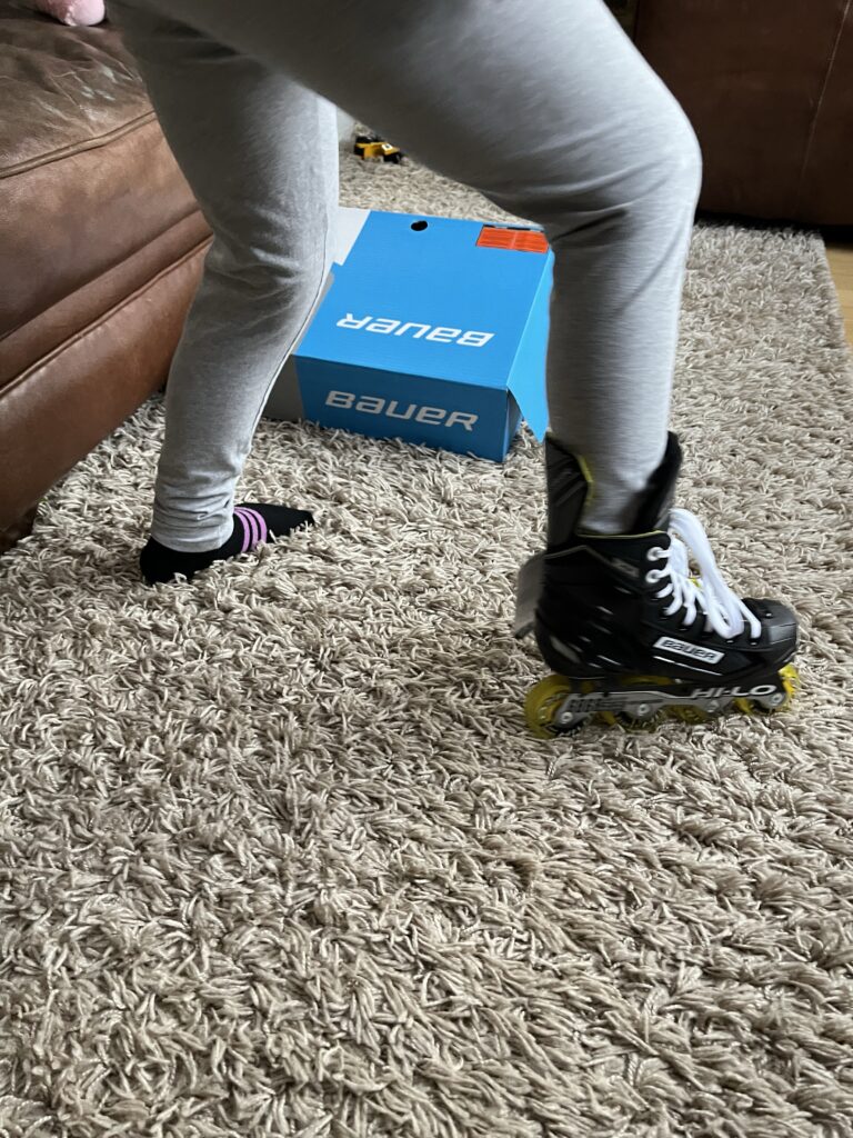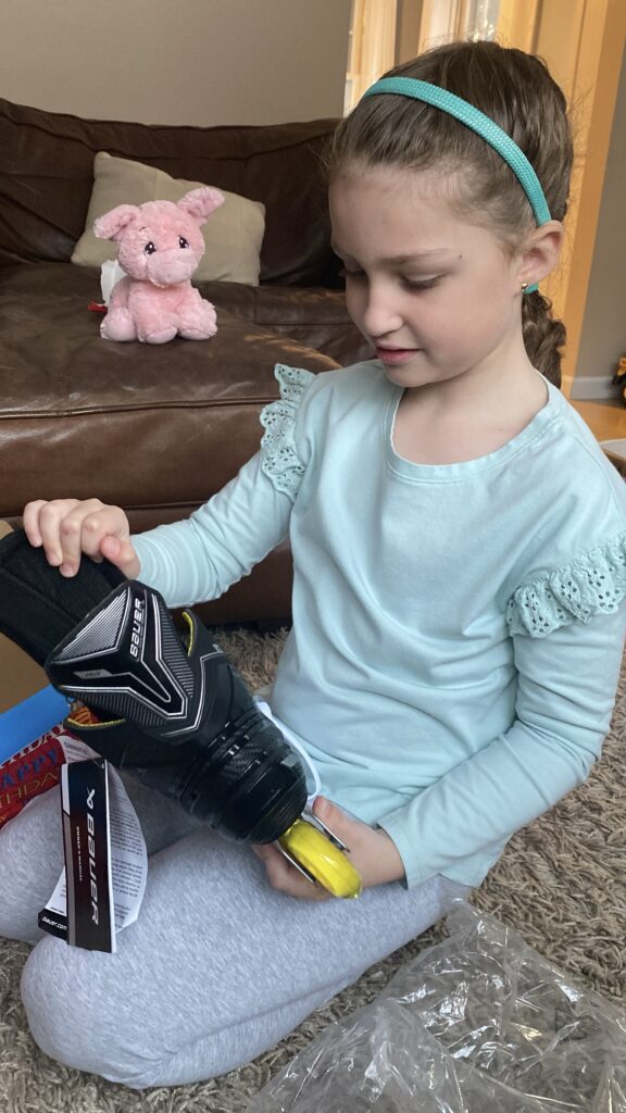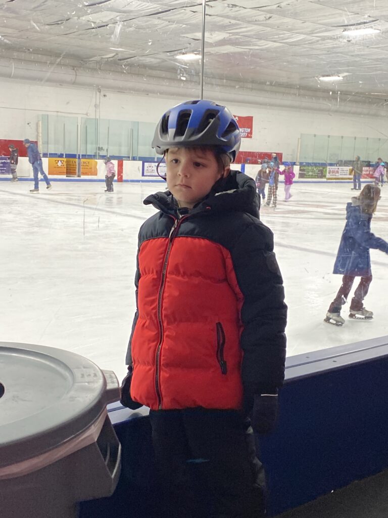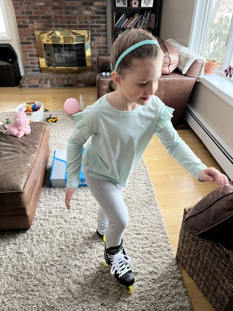 No stranger to being laced up by Daddy. He was “pre-approved” to wear the hockey skates. New skaters are always handed out figure skates, since there’s less rocker in the blade.