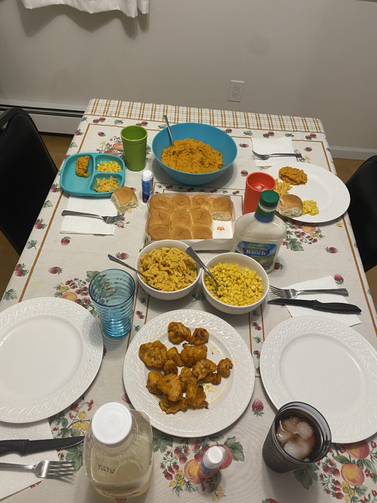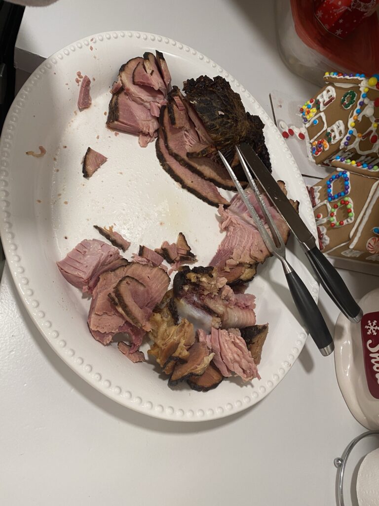 Finally, a lovely traditional-ish Christmas Day dinner prepared by Mommy. (Ham, Buffalo-style Cauliflower, Yams, Corn, Mac and Cheese, Kings Hawaiian Rolls)