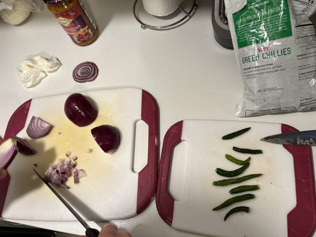 We also never cooked with Green Chilies before … so Shaun tried one before chopping. Long story, short, yes, they’re definitely hot!