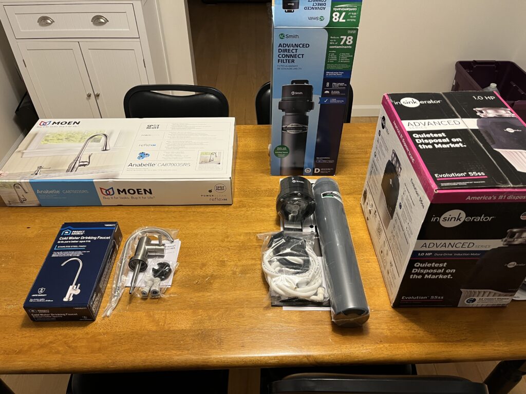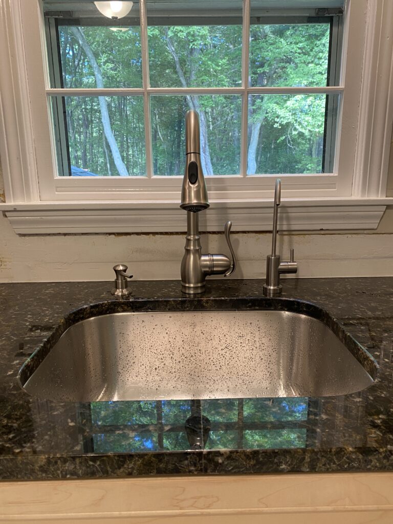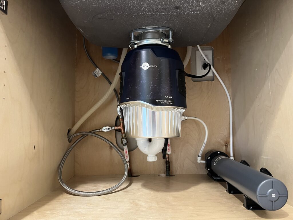 No expense spared! – Under-sink large carbon filter system with a deck-mounted fountain. – Massive 1HP disposal. – Single handle faucet with deck-mount soap dispenser.