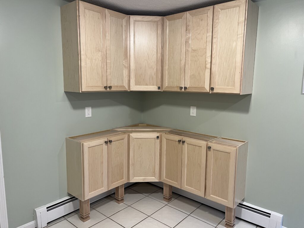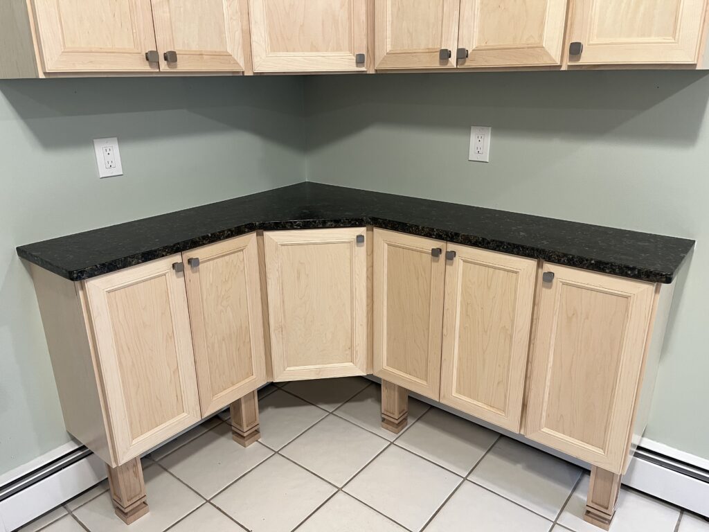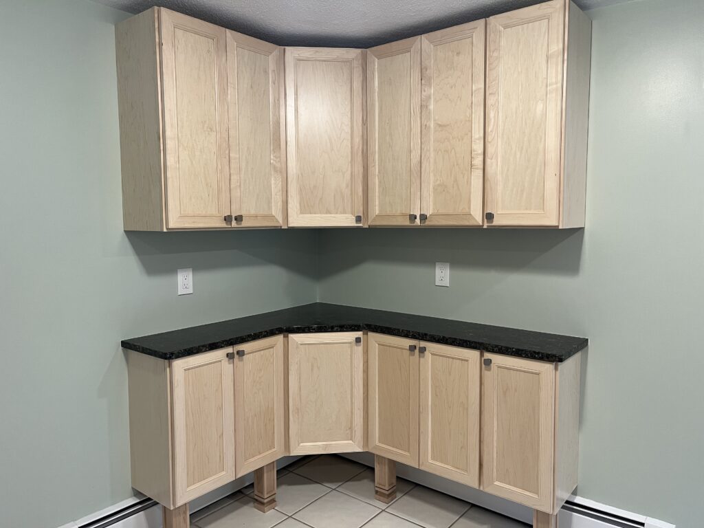 The interior wall has the baseboard heating and had been underutilized as a result. We chose to meet this challenge with a creative solution, and are very pleased with the extra countertop area and cabinet volume!